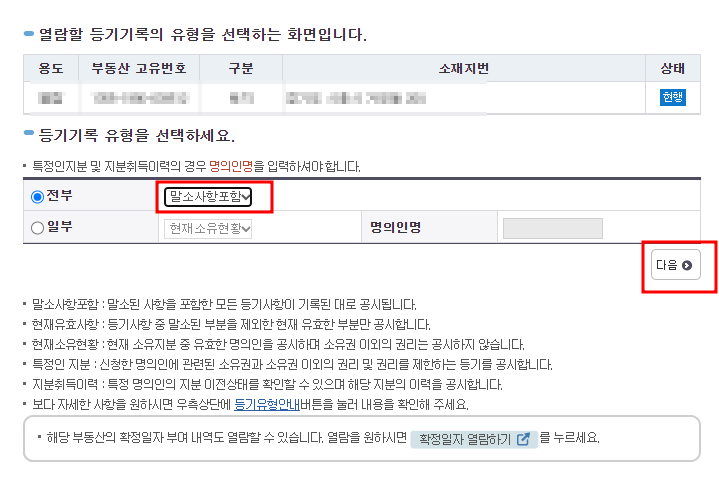 4. 말소사항포함 또는 현재유효사항을 선택하고 다음을 눌러 이동합니다.