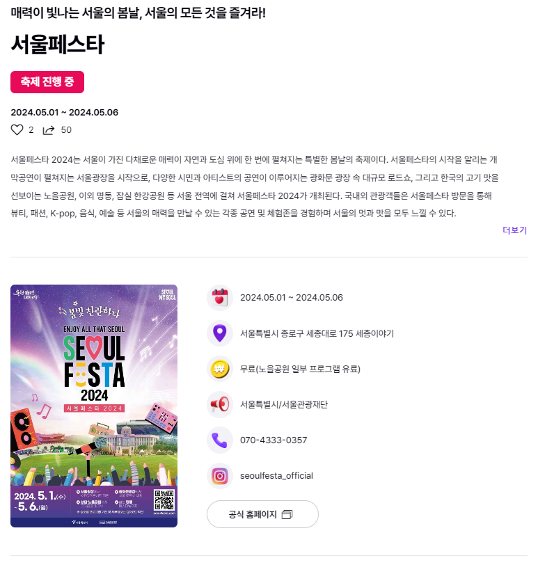 원하시는 축제를 선택하시면 아래와 같이 세부 내용을 확인 하실 수 있습니다.