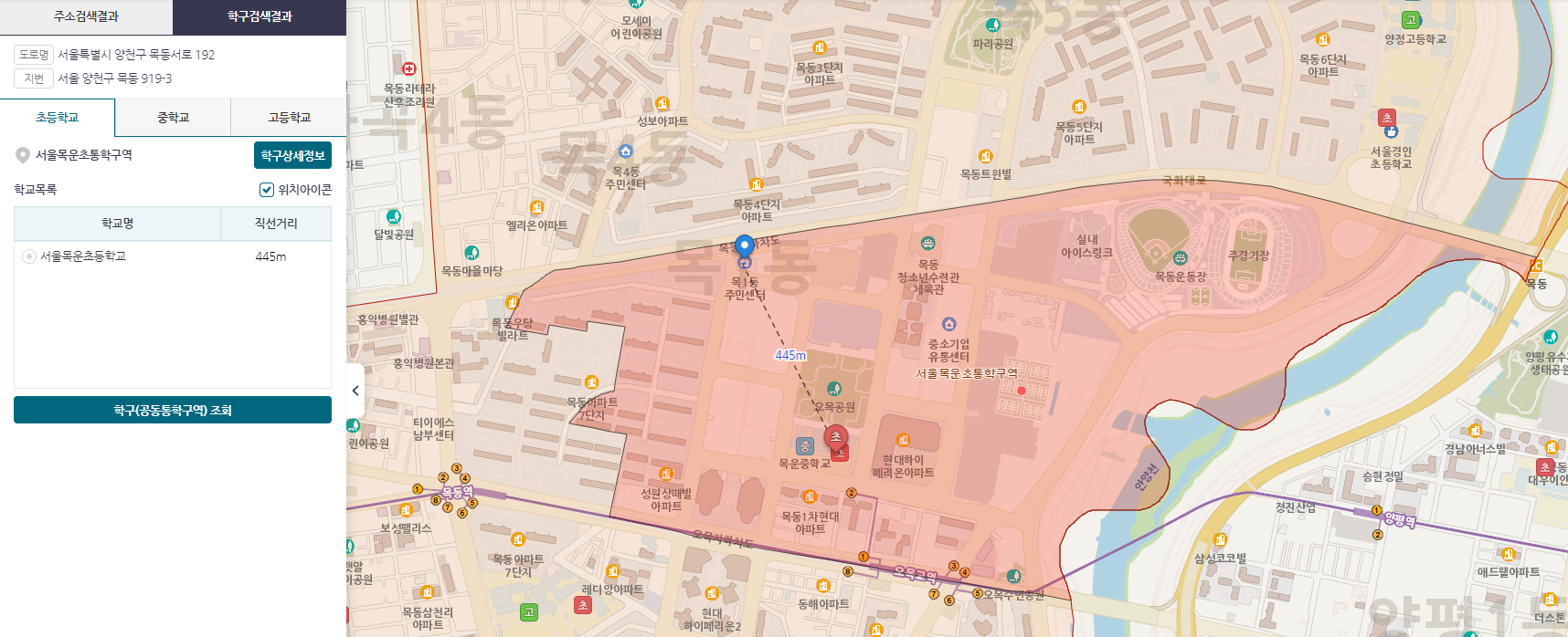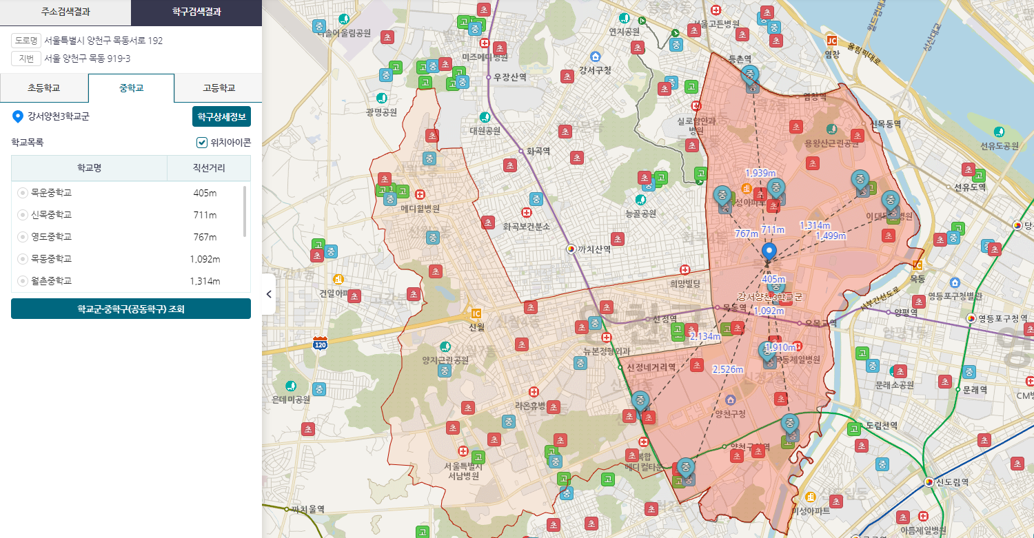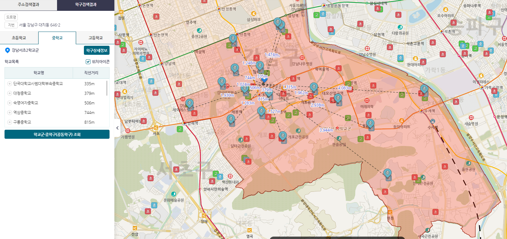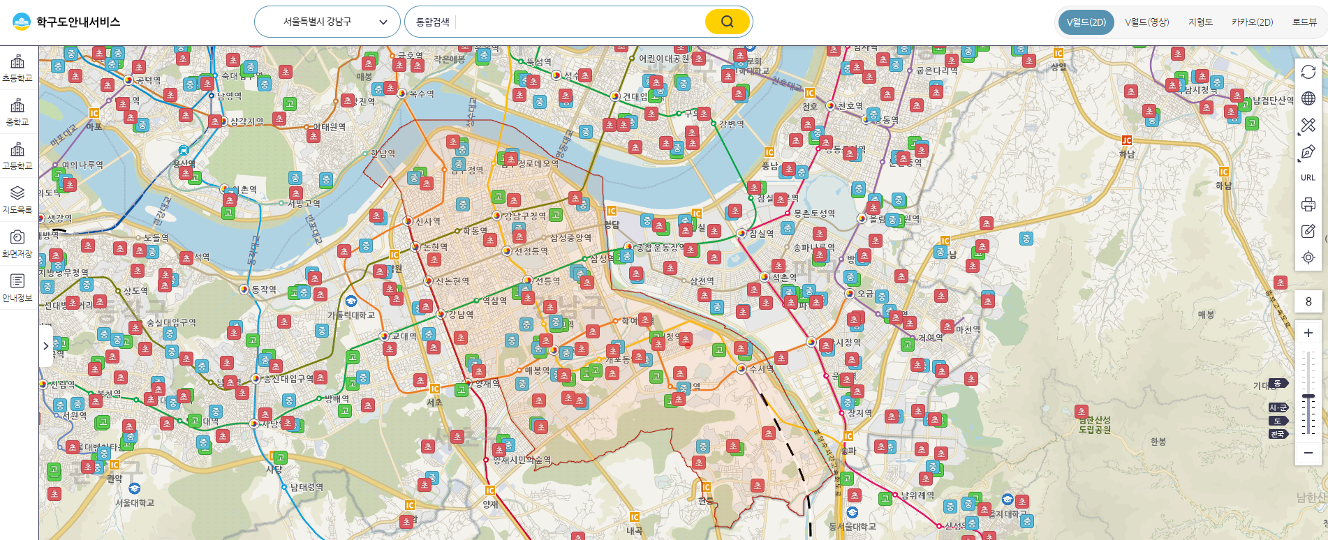 서울 강남구를 선택하면 아래와 같이 지도에 초, 중, 고가 표시됩니다.
